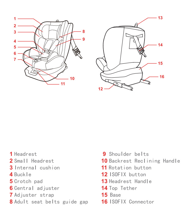 - Soutient face à l'arrière (adapté aux nourrissons et aux jeunes enfants, en protégeant la tête et au cou) et face à l'avant (adapté aux enfants plus âgés), un ajustement de rotation à un bouton, pratique pour monter et descendre de la voiture et interaction.